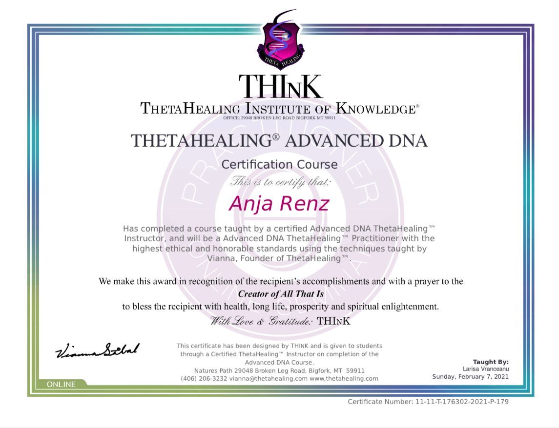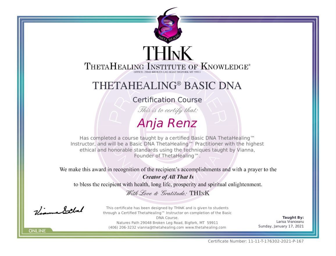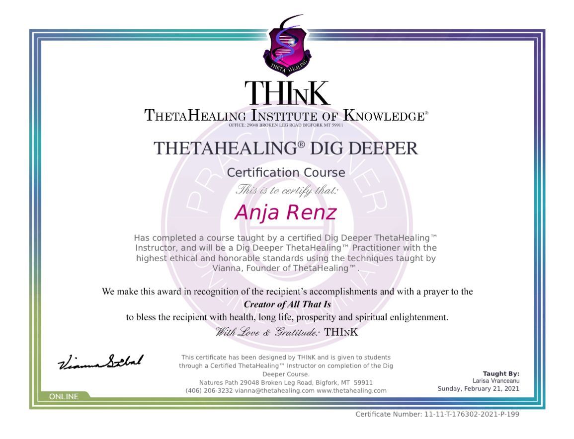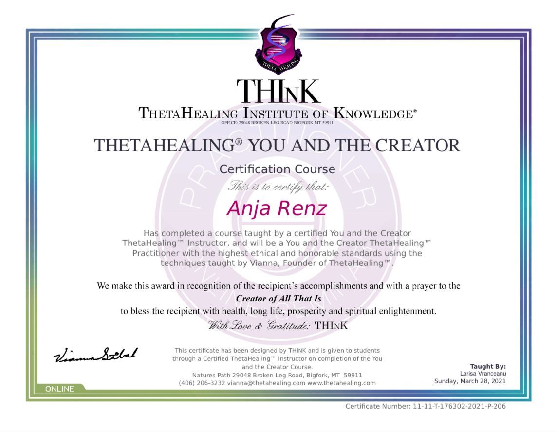 ThetaHealing® zählt zu den Methoden des geistigen Heilens und dient zur Aktivierung der Selbstheilungskräfte. Es ersetzt nicht die Diagnose und Behandlung bei einem Arzt. Für eventuelle Nachfolgen der Behandlung wird nicht gehaftet.